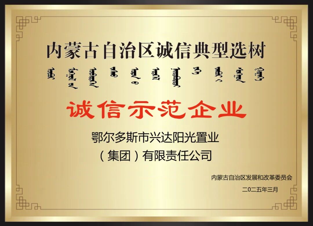 近日,内蒙古自治区发展和改革委员会公布了2025年第二批自治区诚信典型企业名单,经过层层推荐筛选、严格审核,鄂尔多斯兴达阳光置业集团有限责任公司脱颖而出,榜上有名,荣获自治区“诚信示范企业”称号。