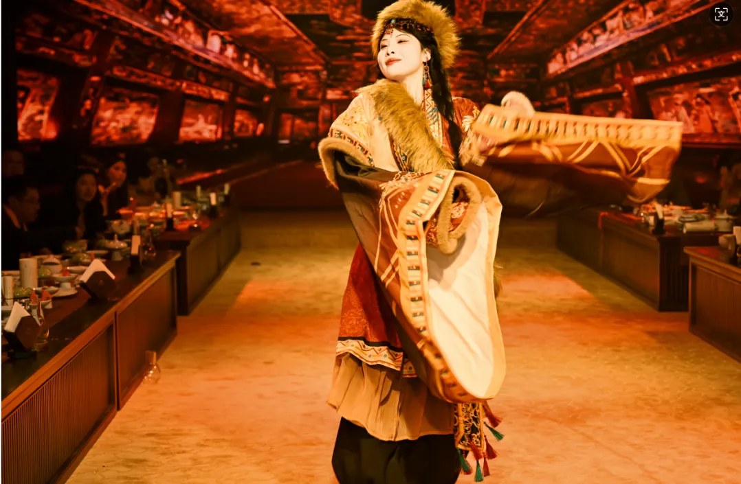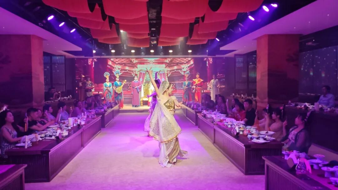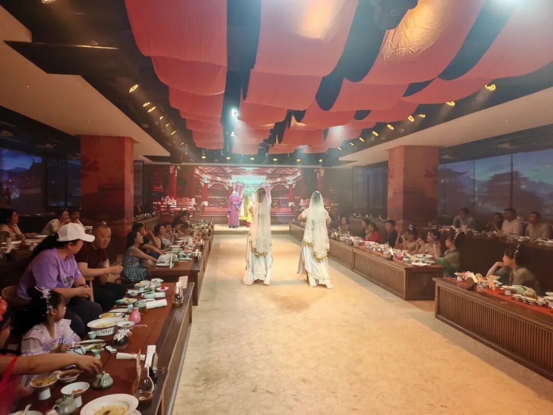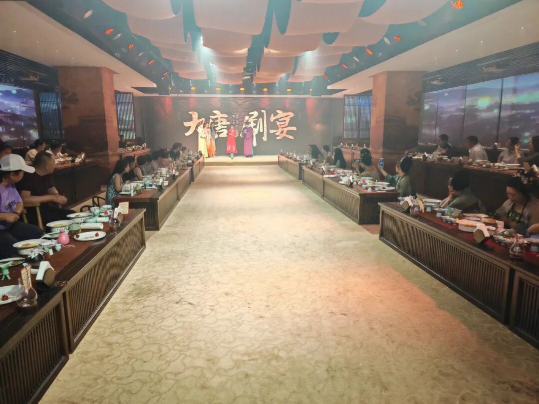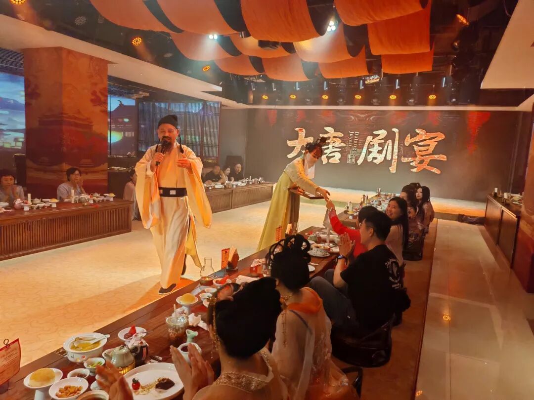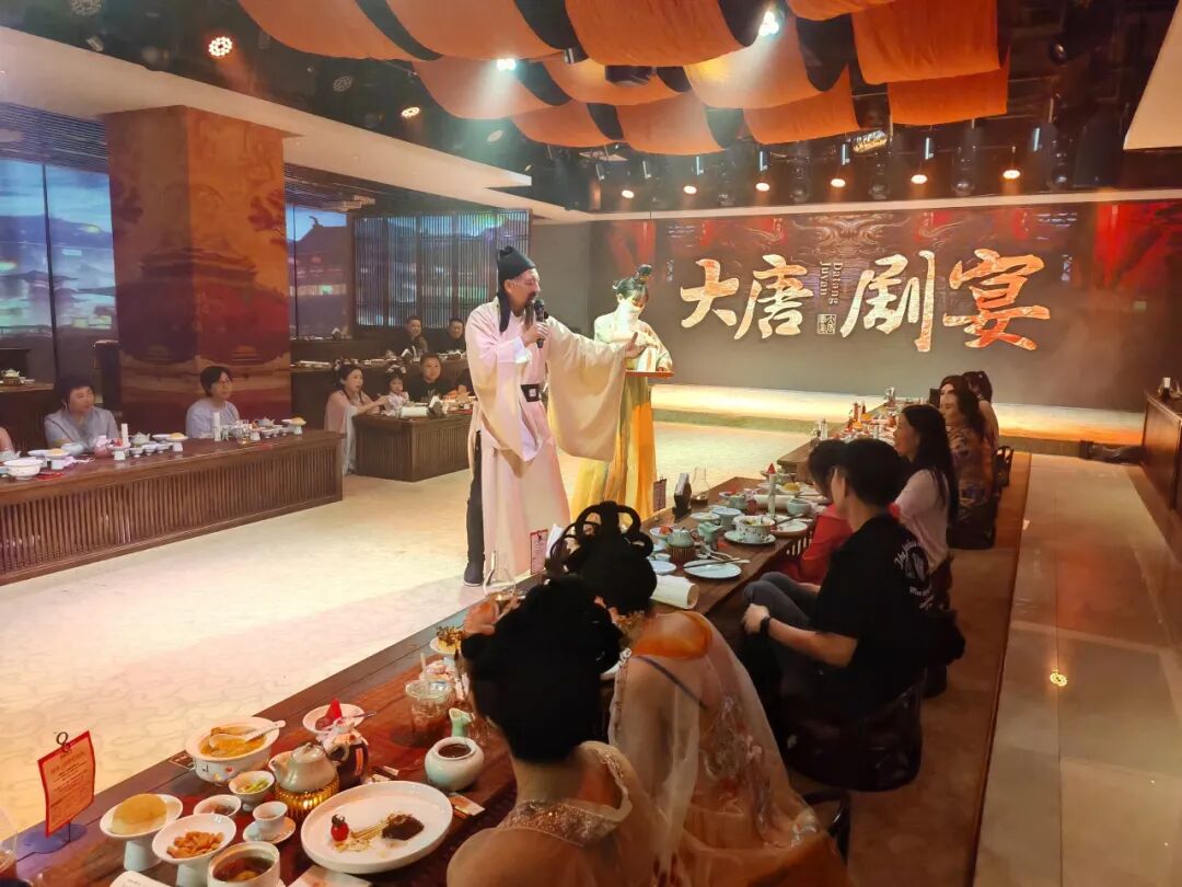 调研组一行深入大唐剧宴进行了实地察看,详细了解了“实景演艺+餐饮”的新业态模式运营情况,并进行了现场体验。 大唐剧宴由河南仲记新农业发展有限公司打造集餐饮、文化、旅游为一体的新项目。该项目总投资600万元,秉承中原几千年的文化精髓,将盛唐气象与现代艺术手段相结合,为广大游客呈现一场沉浸式的宫廷美馔与演艺盛宴,并以穿越历史的人文体验,吸引了当地消费者与游客的关注喜爱。 大唐剧宴特色亮点 沉浸式剧场体验 •真实还原盛唐场景:精心设计的舞台布置与服饰,让您仿佛置身于唐朝皇家,感受盛世大唐的辉煌。 • 高质量演艺表演:由专业演员倾情演绎大唐名臣、诗人李白等历史人物的精彩故事,通过舞蹈、诗词、音乐等多种艺术形式,带您领略大唐的文化魅力。 皇家美馔盛宴 • 精致宫廷菜肴:由顶级厨师团队精心烹制的多道大唐宫廷美食,如“君王汤”、“松赞牛肉”、“佛跳墙”等,让您的味蕾踏上一场历史的旅程。 • 互动上菜体验:宫女演员为您亲自上菜,体验古代贵族的尊贵待遇,感受皇宫宴会的独特氛围。 文化互动环节 • 诗词对答:与“诗人李白”互动,对诗词赢取精美奖品,增添观演乐趣。 • 汉服体验:提供精美汉服与妆造服务,让您尽情穿越,成为大唐的一员。 多元文化融合 • 多国使者表演:展示大唐与世界各国的友好交流,感受多元文化的碰撞与融合。 • 藏族舞蹈:精彩的藏族舞蹈“冰山来客”,展现大唐时期的民族和谐与文化交流。