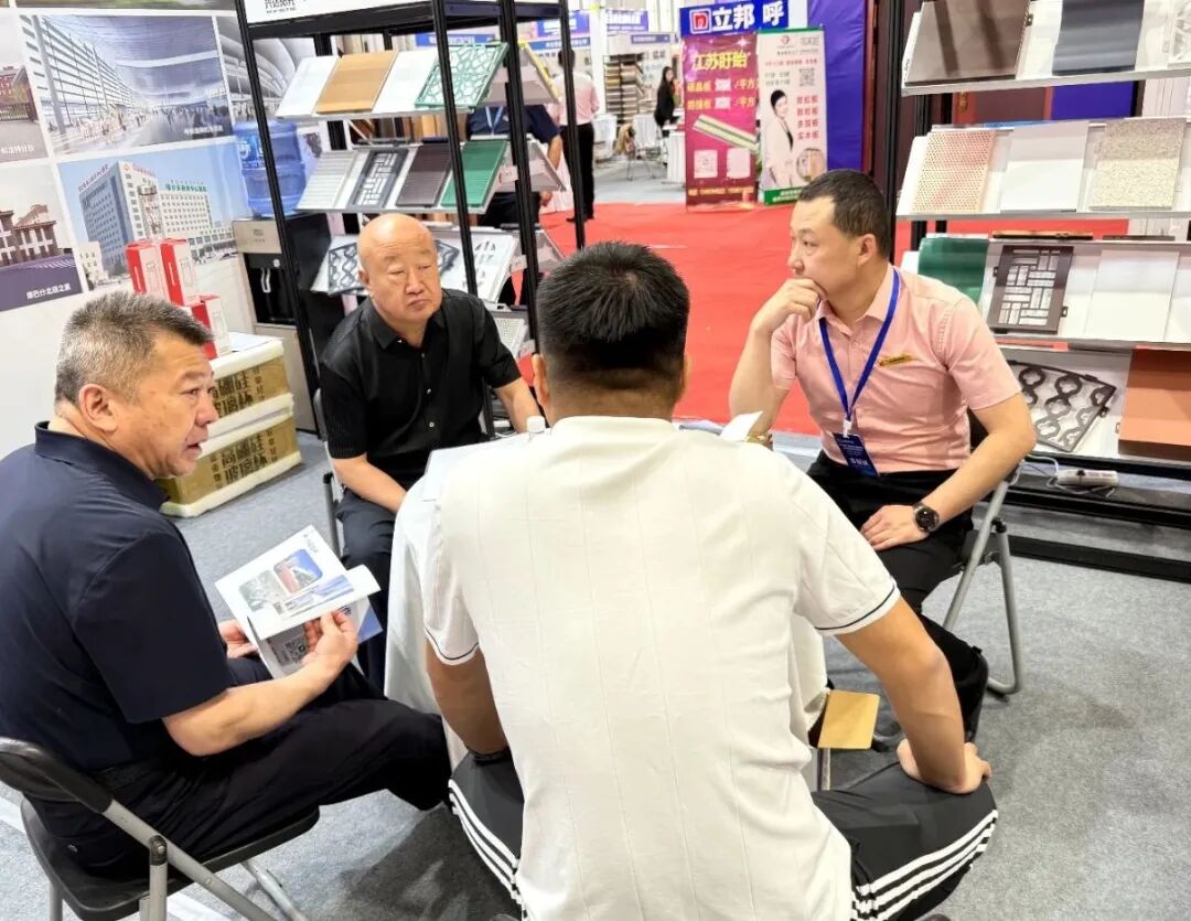 在展会现场,金诚铝业的展位设计独具匠心,通过展示铝单 板多种应用场景,生动地展现了铝单板在建筑装饰中的广泛用途。 工作人员热情地向参观者介绍产品特性、优势及应用案例,耐心解答疑问。一位建筑商参观后表示:“金诚铝业的铝单板产品质量过硬,设计新颖,与当下建筑市场需求十分契合,值得在项目中推广应用。”截止目前,金诚铝业已与10多家客户初步达成意向性合作协议。