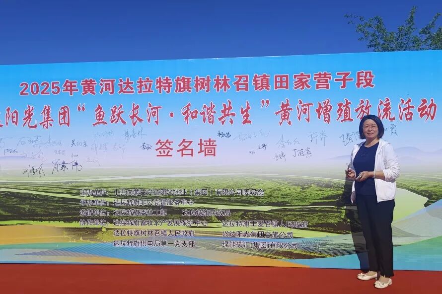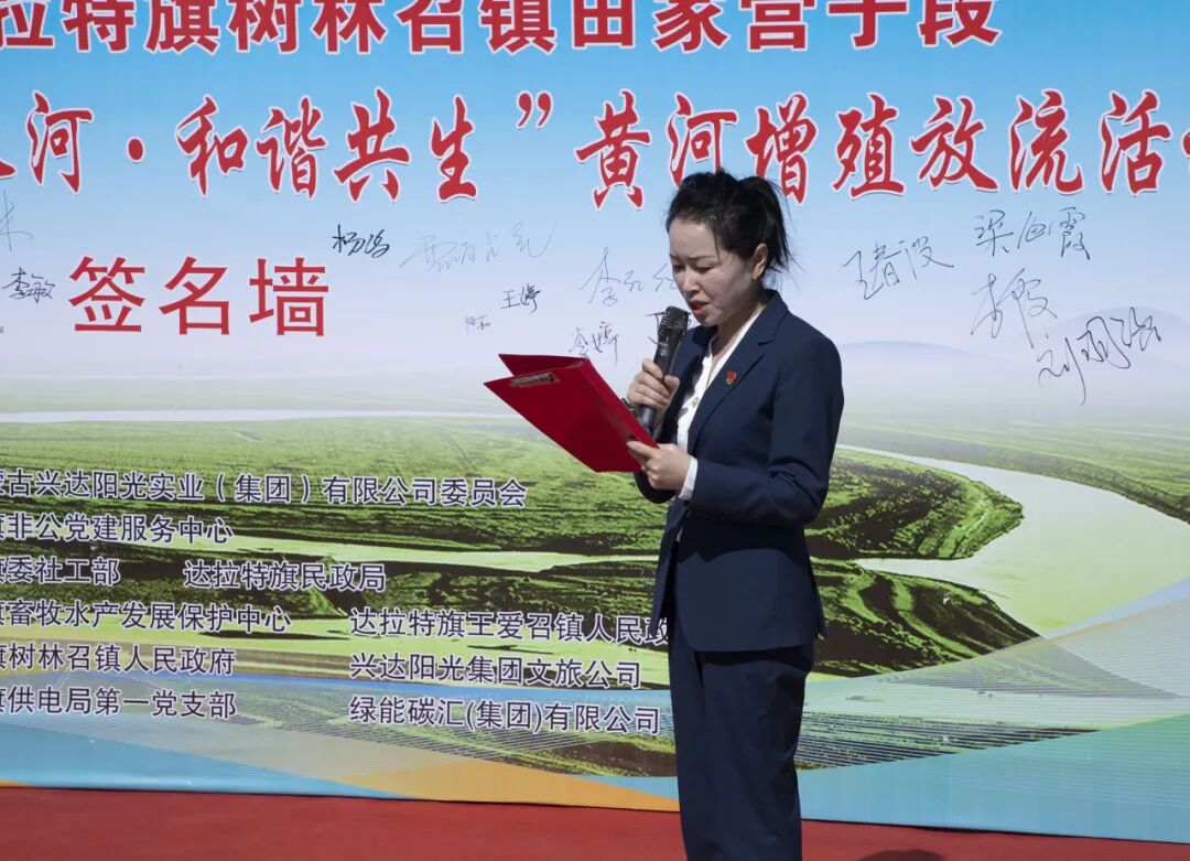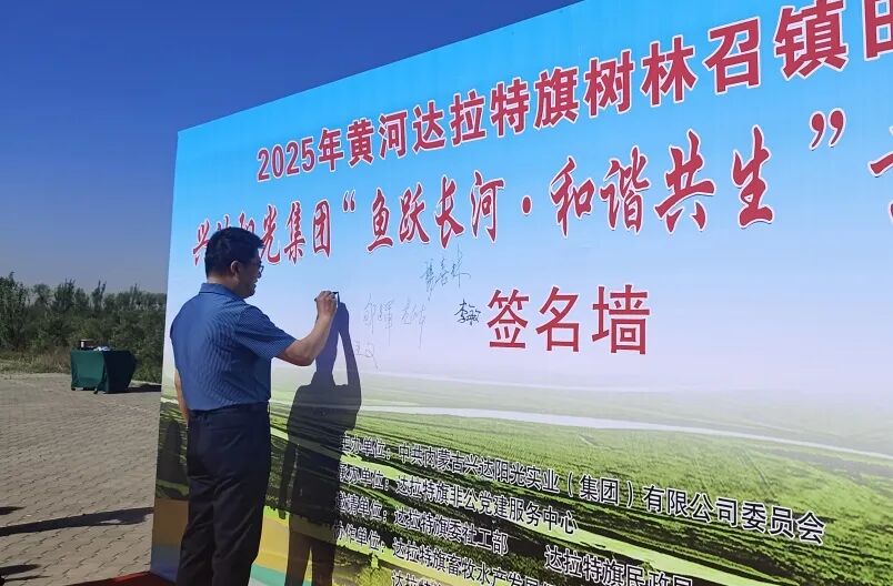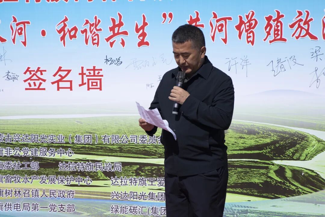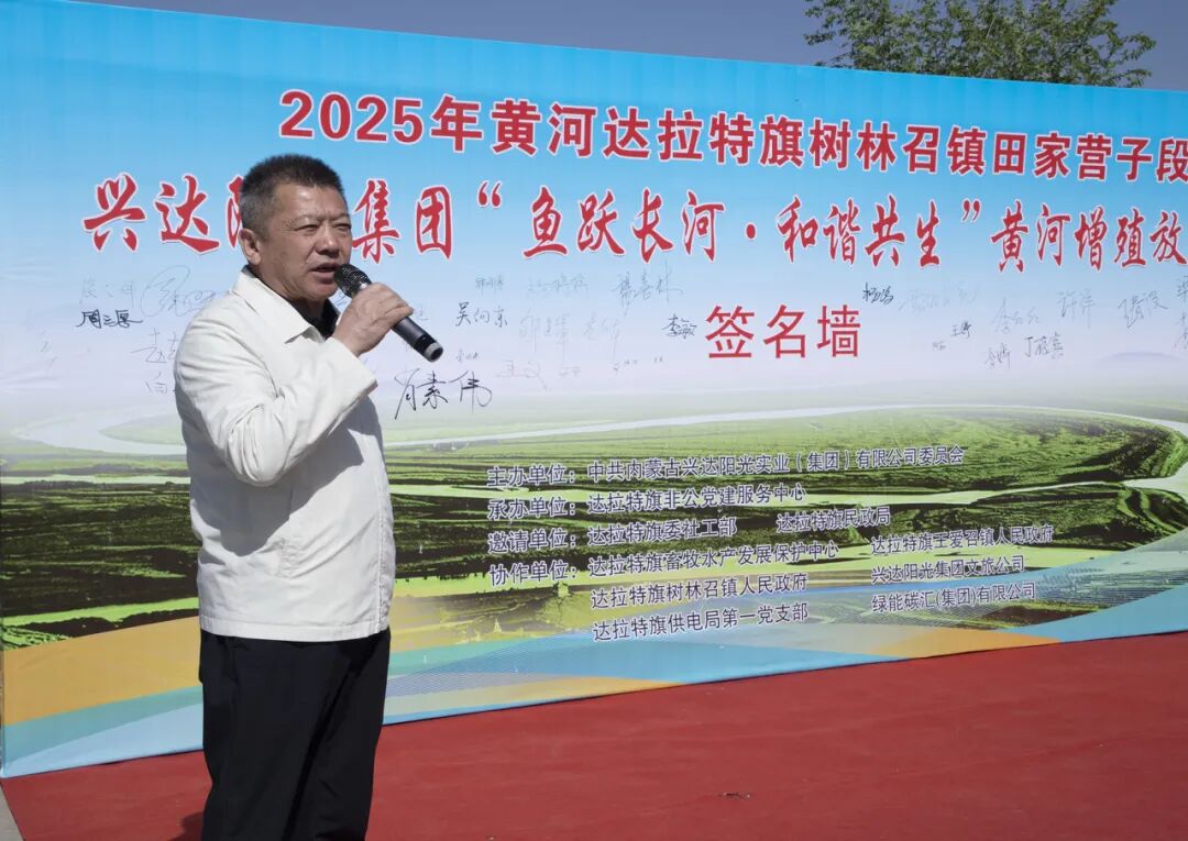 达拉特旗王爱召镇党委书记韩晓博,达拉特旗委社会工作部副部长、“两新”工委书记王浩绩,达拉特旗民政局副局长梁海霞,达拉特旗畜牧水产发展保护中心主任布赫等指导协作单位、共驻共建单位相关领导应邀参加活动。集团董事长杨喜林,集团党委副书记袁智华、李敏以及集团党建顾问、党建指导员、各支部书记、全体行政人员参加活动。 集团党委副书记李敏主持放流活动启动仪式。 达拉特旗畜牧水产发展保护中心主任布赫在放流活动启动仪式上讲话。他指出,开展黄河增殖放流活动,是深入贯彻落实习近平生态文明思想的重要举措,是养护黄河水生生物资源、改善水域生态环境的有效途径,也是兴达阳光集团践行绿色发展理念、勇担社会责任的具体行动。让我们以兴达阳光集团为示范,用实际行动“保护黄河生物资源,共建绿色生态水道”,让水清鱼跃成为达拉特沿黄生态环境的鲜明标志,让母亲河永葆生机活力,永远造福子孙后代! 兴达阳光集团董事长杨喜林宣布增值放流活动开始。 活动中,全体人员遵循行业标准,按照规范流程共向黄河投放鲢鱼苗1万多尾,用实际行动彰显了感恩母亲河、守护母亲河的担当和责任。 活动中,全体人员还在签名墙上签名,共同表达了敬畏母亲河、感恩母亲河、守护母亲河的情怀。 此次增殖放流活动由兴达阳光集团党委主办,达拉特旗非公党建服务中心承办,达拉特旗委社会工作部、达拉特旗民政局、达拉特旗畜牧水产发展保护中心、达拉特旗王爱召镇人民政府、达拉特旗树林召镇人民政府、兴达阳光集团党委部分共驻共建单位、兴达阳光集团文旅公司指导协办。活动旨在进一步传承和弘扬黄河文化,促进水域生态平衡的恢复和保护,用实际行动保护“母亲河”,示范引导社会各界共同构建鱼水相亲、人与自然和谐相处的绿色生态家园。